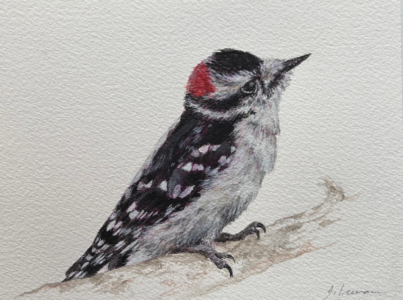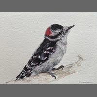 Jessica Levman Downy Woodpecker Ink, watercolour and gouache on paper, 5 x 7 |