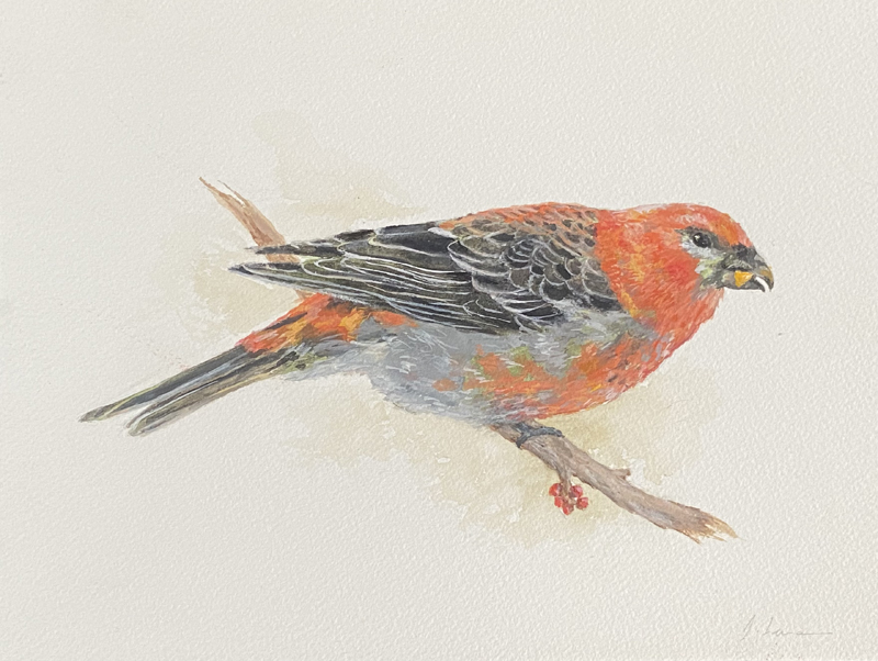 Jessica Levman Pine Grosbeak Ink, watercolour and gouache on paper, 7 x 9 (framed 14.5 x 16.75) |