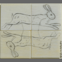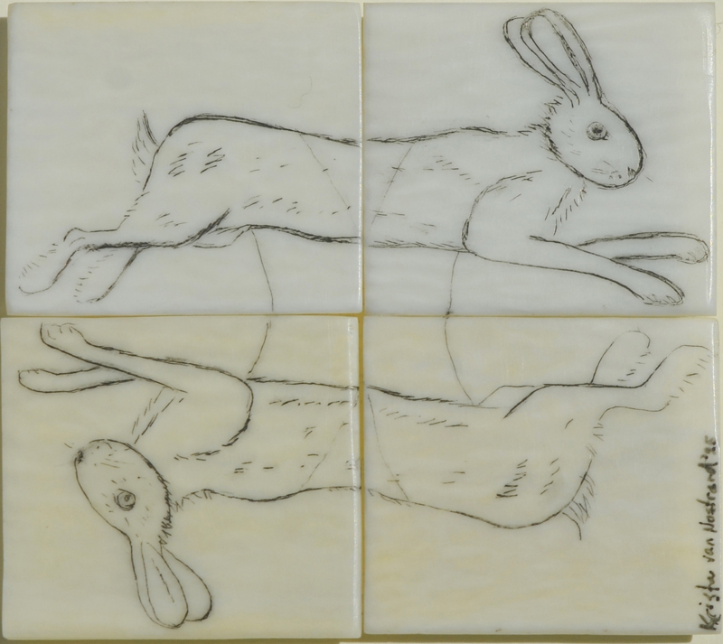 Krista van Nostrand Four 'Rabbits': Splitting Hares Scrimshaw on antique ivory piano keys, 2 x 1 13/16 (Framed 9 1/2 x 9 1/8) |