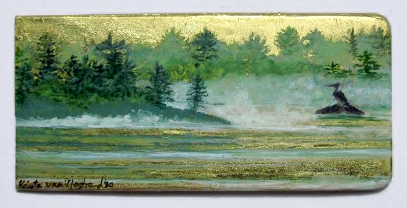 Krista van Nostrand Silent Heron In The Early Morning Mist Watercolour and gold leaf on antique ivory piano keys, 1 13/16 x 7/8 (framed 8 9/16 x 9 10/16) |