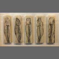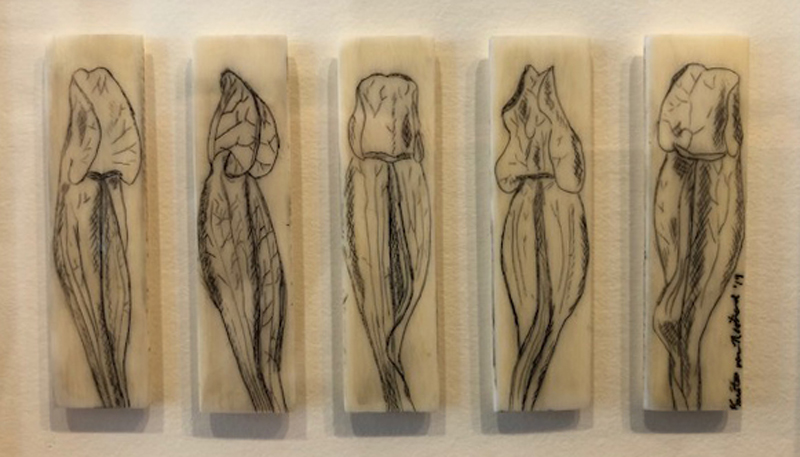 Krista van Nostrand Five Pitchers India Ink Scrimshaw on Antique Ivory Piano Keys, 2 7/8 x 4 3/8 |