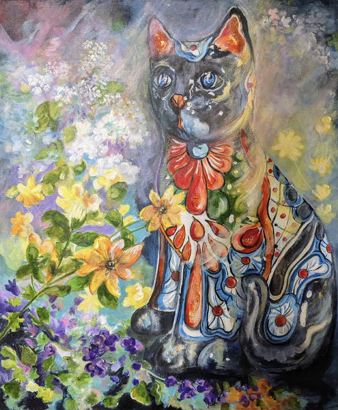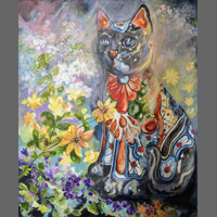 Jackie Evans Ceramic Lawn Cat acrylic, gold dust pigment and oil pastel on canvas 24 x 20 |