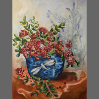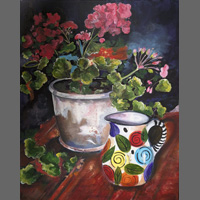 Jackie Evans Dogberries and Lavender acrylic, silver paper and oil pastel on canvas 24 x 18 |