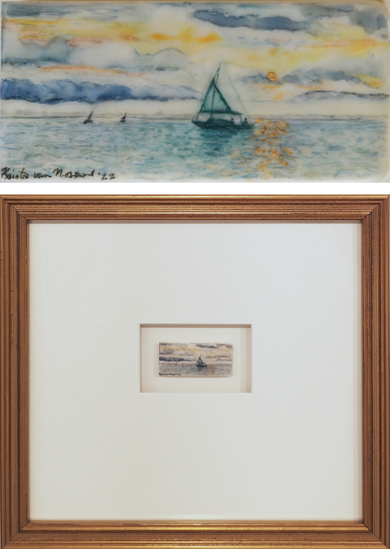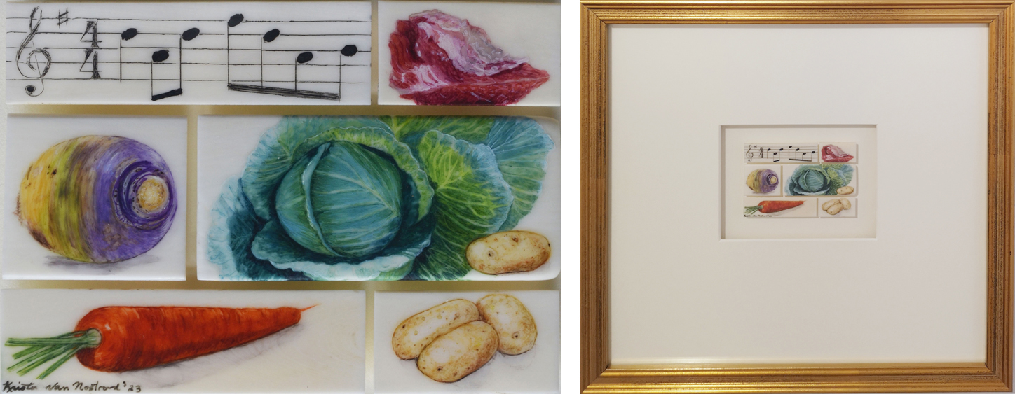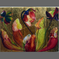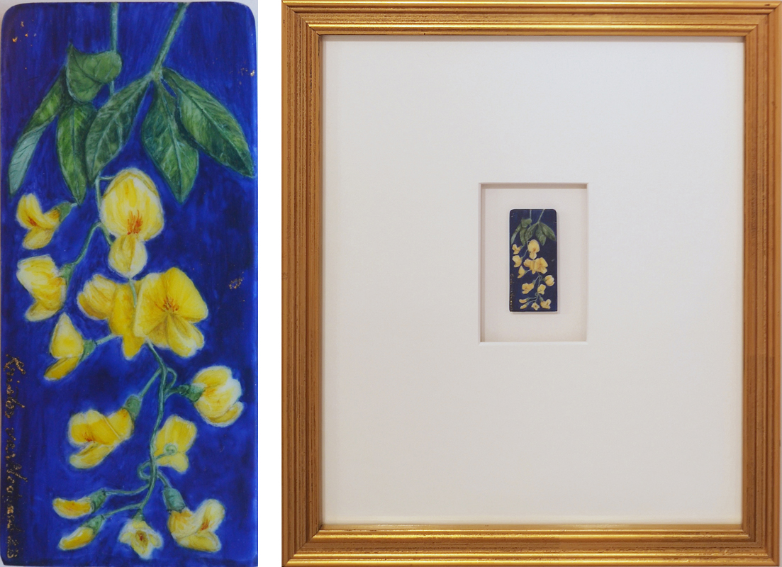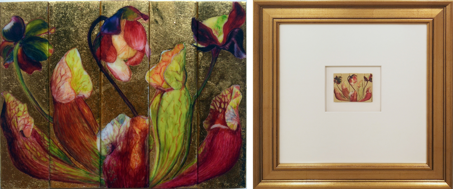 In a world which is "too much with us" Krista van Nostrand's delicate, meticulous watercolours entice you to pause, magnifying glass in hand and to step into the world in miniature. Each painting is an invitation to slow down, to look closely, to appreciate and to savour the beauty of the natural world. In her miniature watercolors she draws inspiration from the history of miniature watercolour painting on ivory, medieval illuminated manuscripts, Japanese lacquer work, antique enamel jewelry, the English watercolour masters and, Art Nouveau decorative arts. Her miniature gems, painted on translucent ivory, have a luminous quality which can not be achieved on paper. Using keys conserved from antique pianos her work explores new possibilities for this classical genre creating mixed media works with gold and silver leaf. Her unique paintings often have musical titles and explore the connections among the natural world, music, and antique objects and the stories that they tell.
